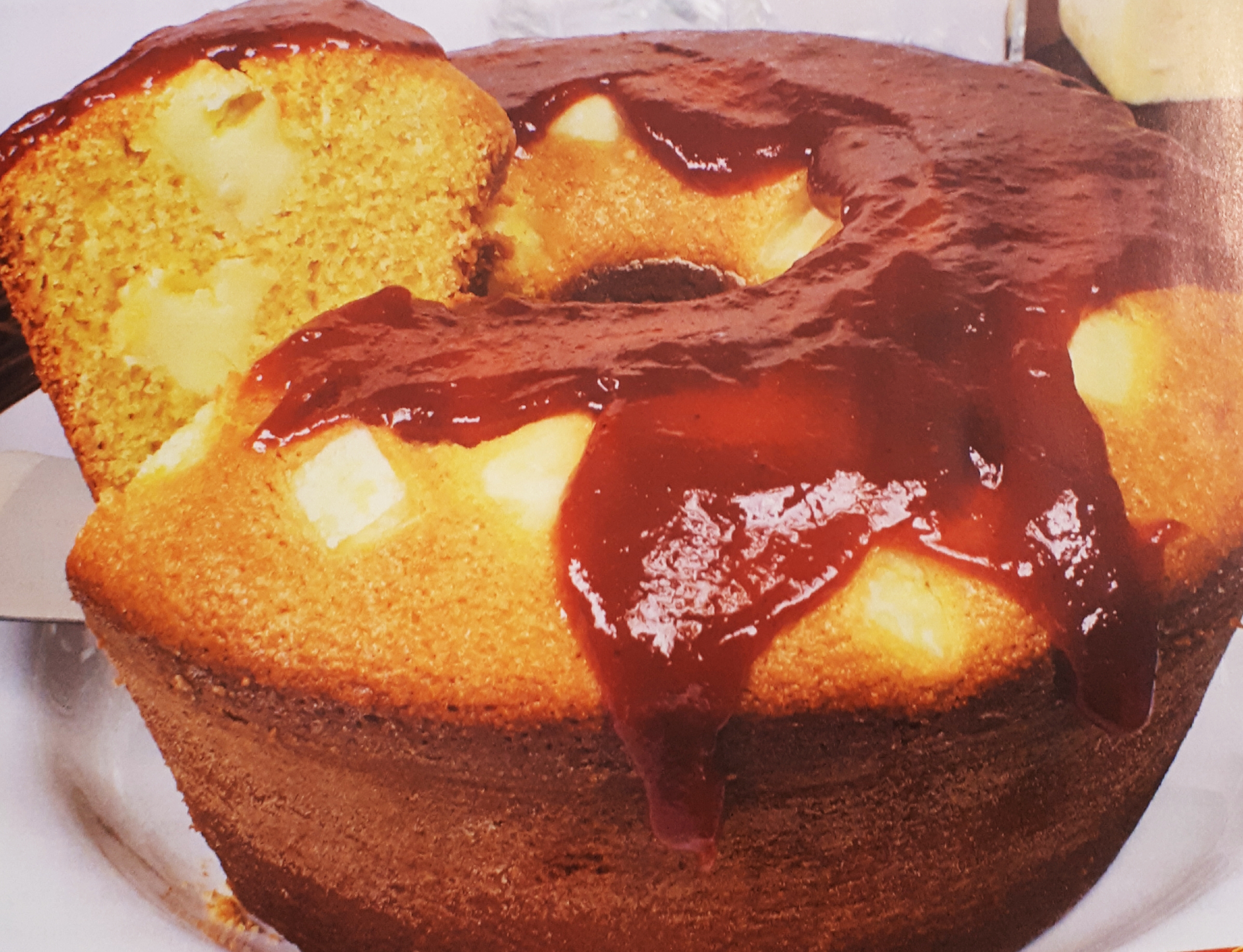 Passe os cubos de queijo pela maisena e espalhe sobre a massa do bolo.