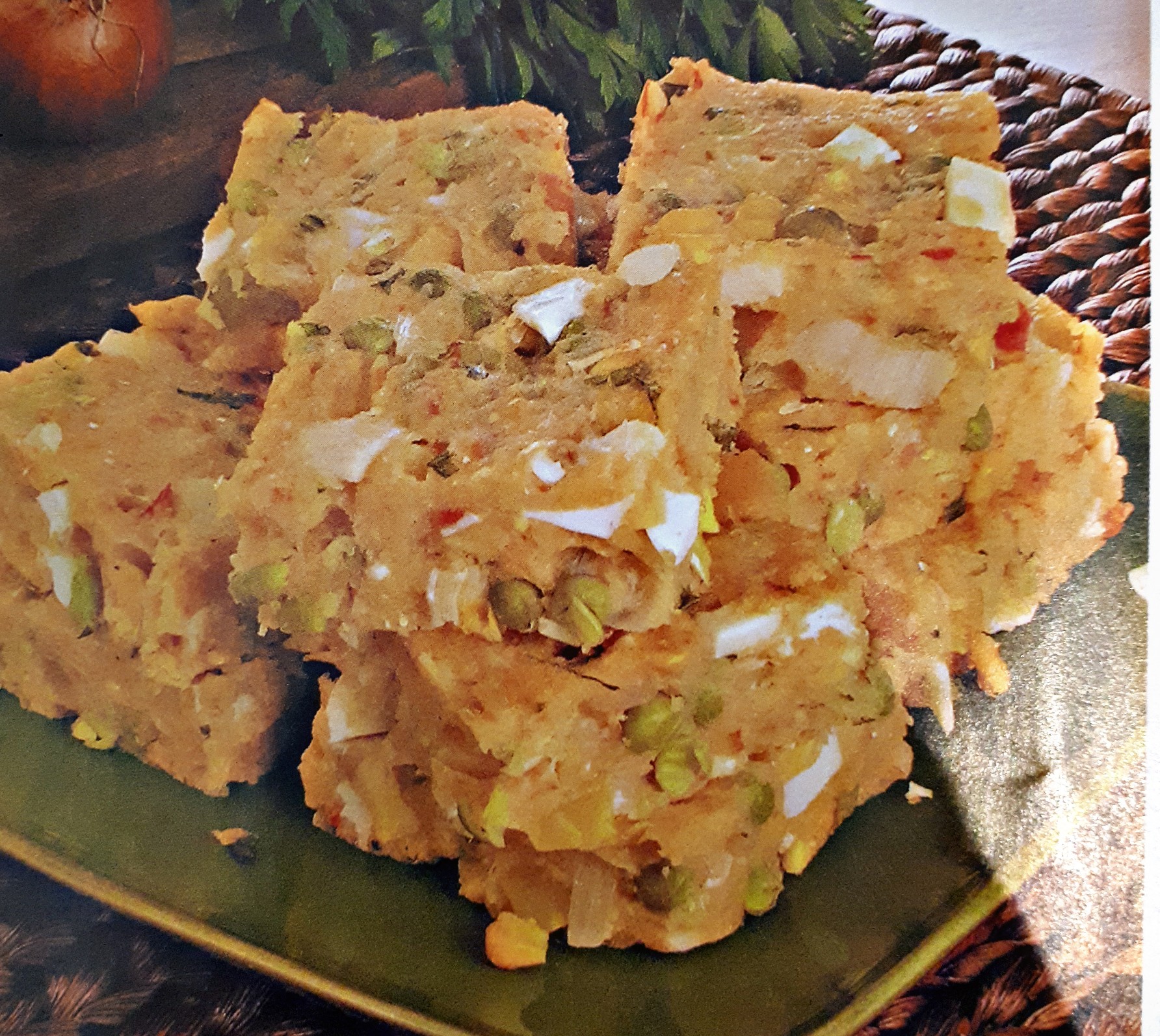 Misture o ovo, a azeitona, o cheiro verde e espalhe em uma travessa retangular média untada, alisando com uma espátula.