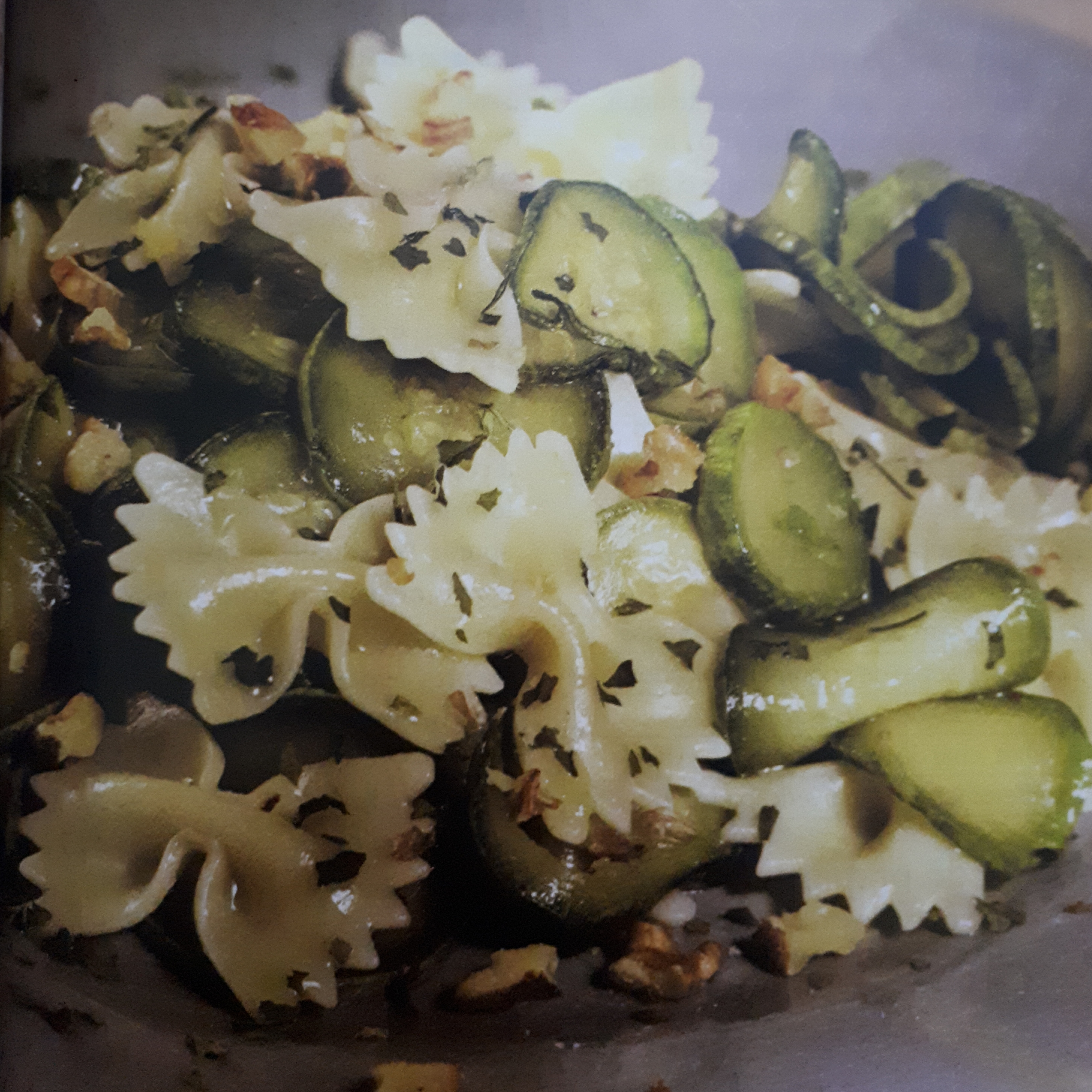 Adicione as abobrinhas, a salsa desidratada e o macarrão e sacuda a panela para misturar bem os ingredientes.